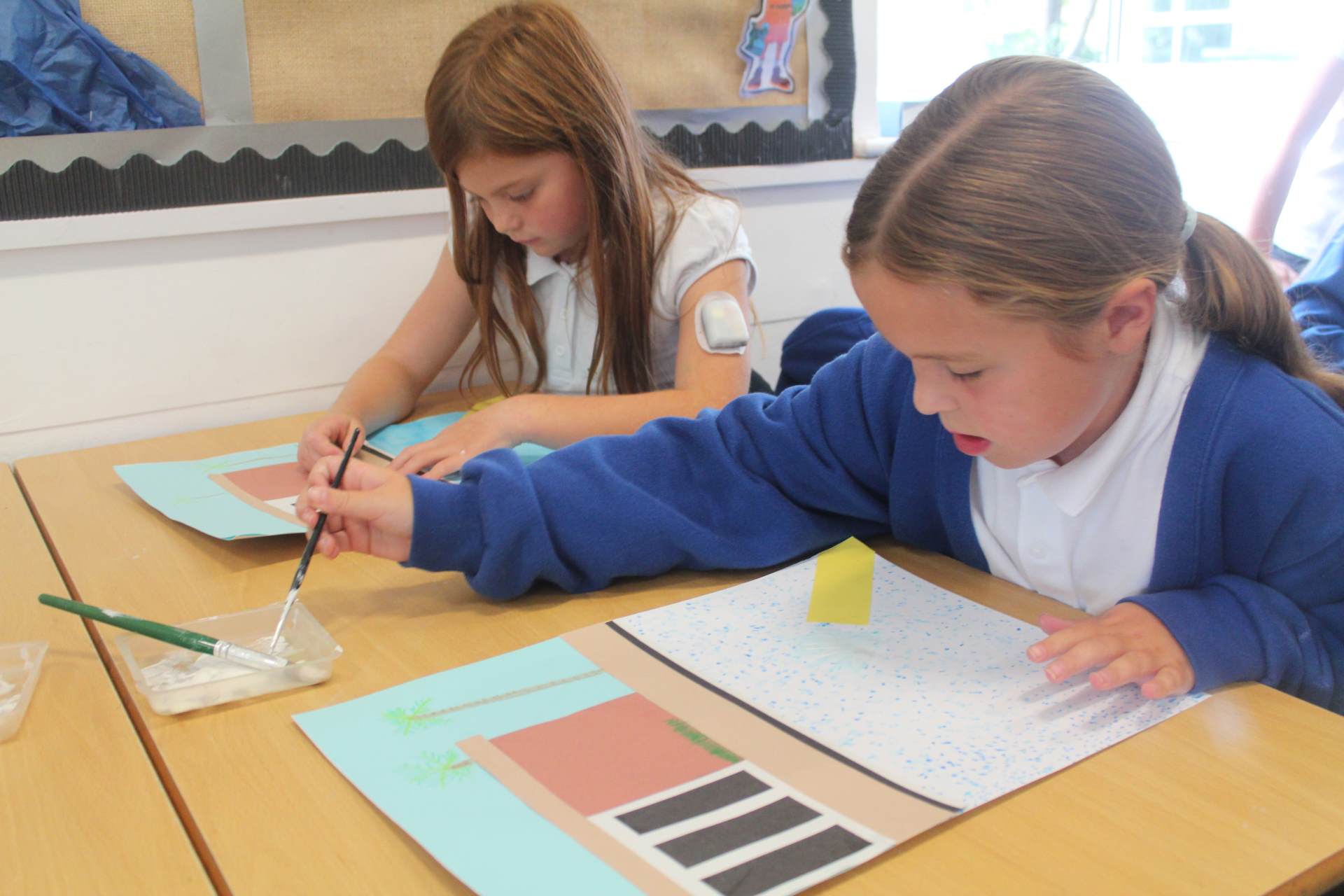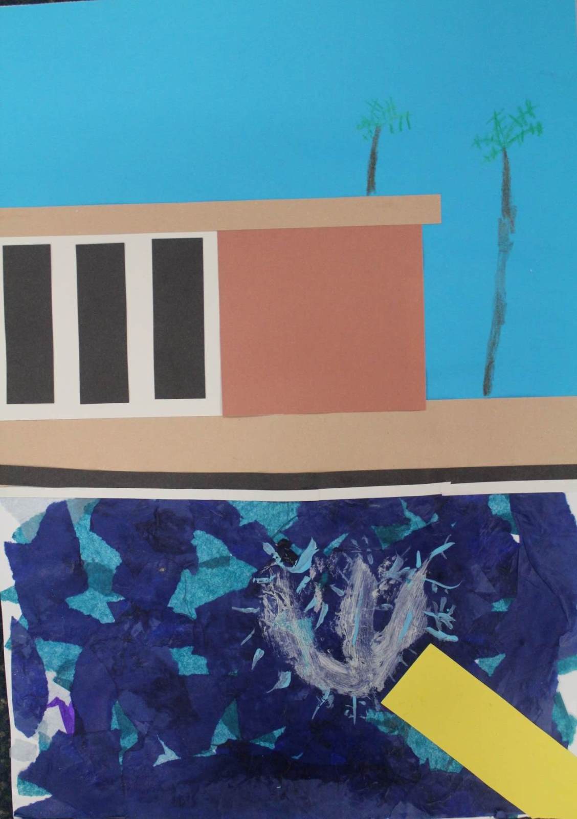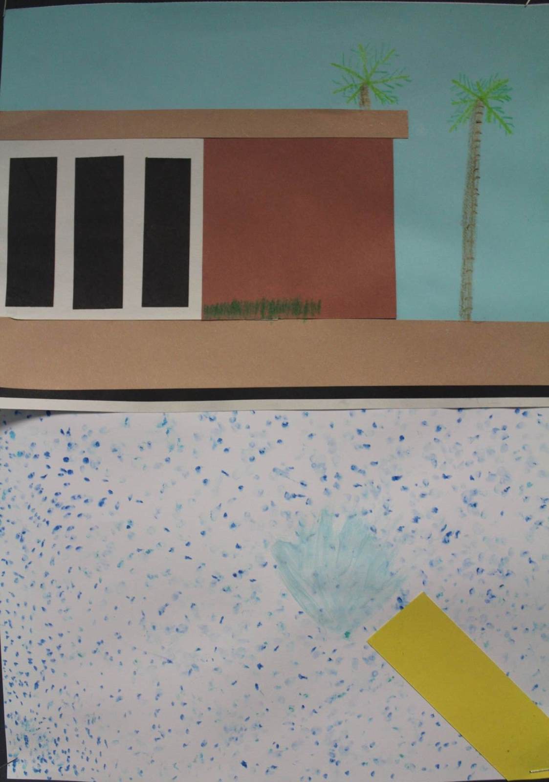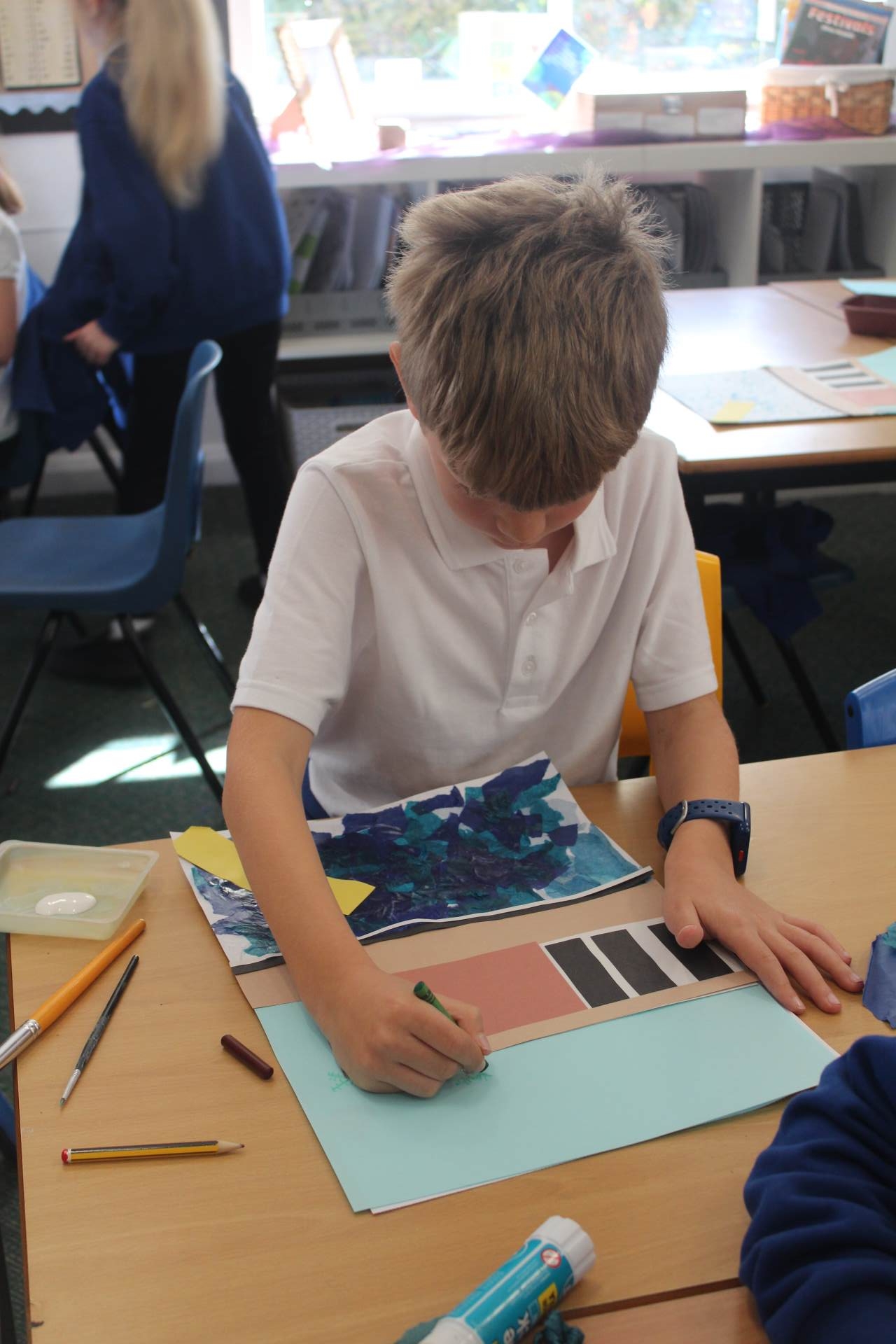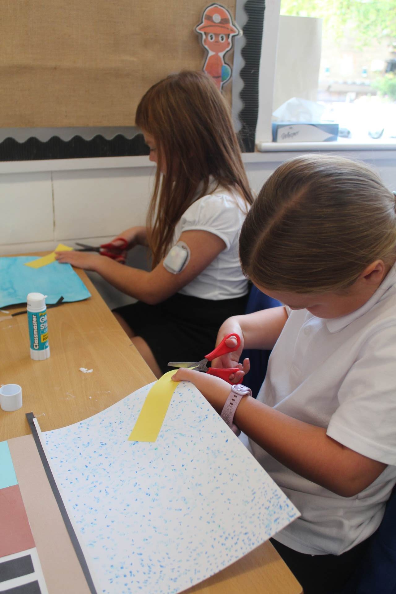Class 4 have been looking at the British artist David Hockney and his painting A Bigger Splash. The children tried out different techniques to represent water before creating their own version of A Bigger Splash, choosing their preferred water technique for the pool and using collage for the buildings.