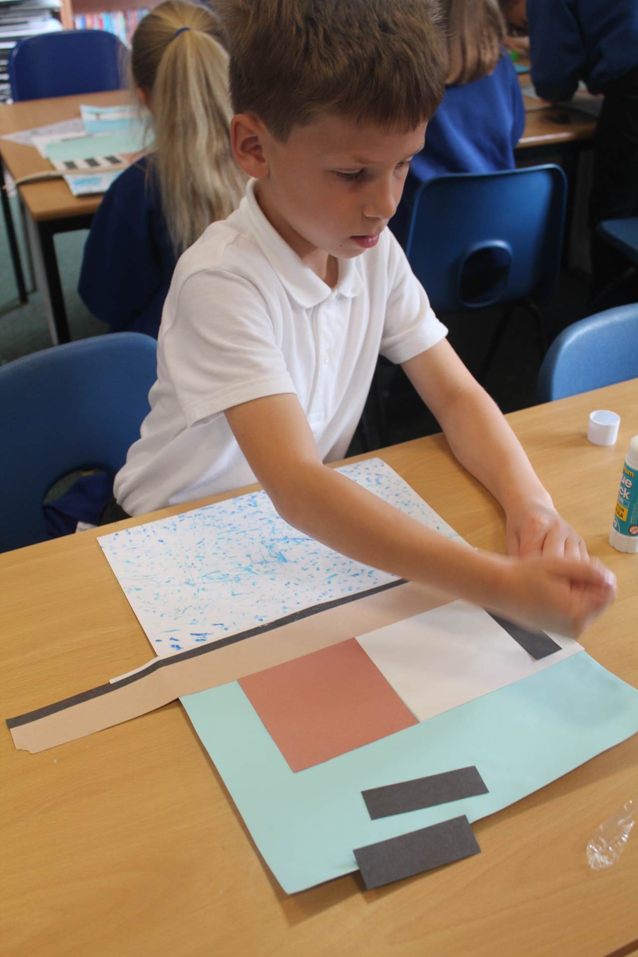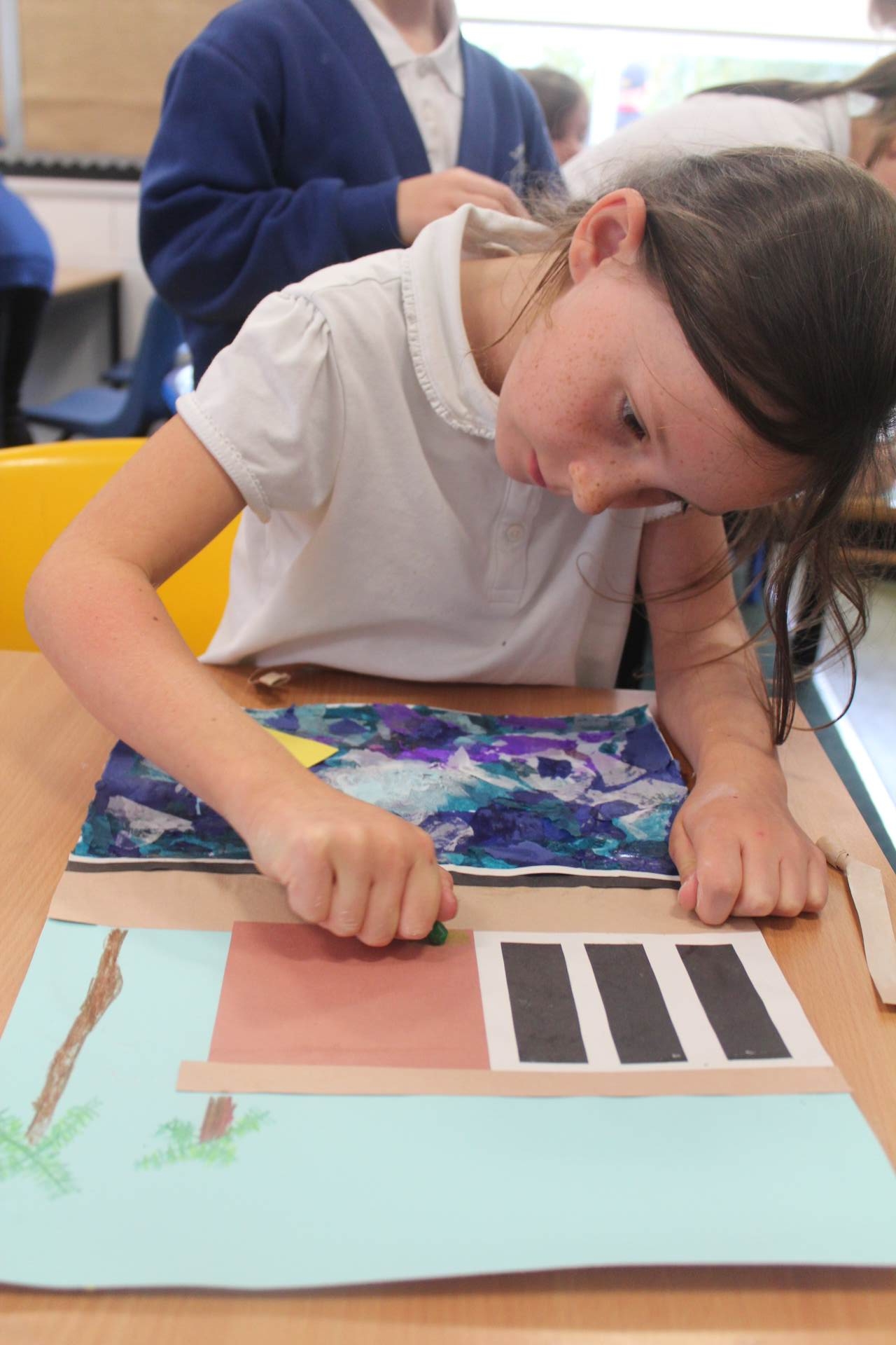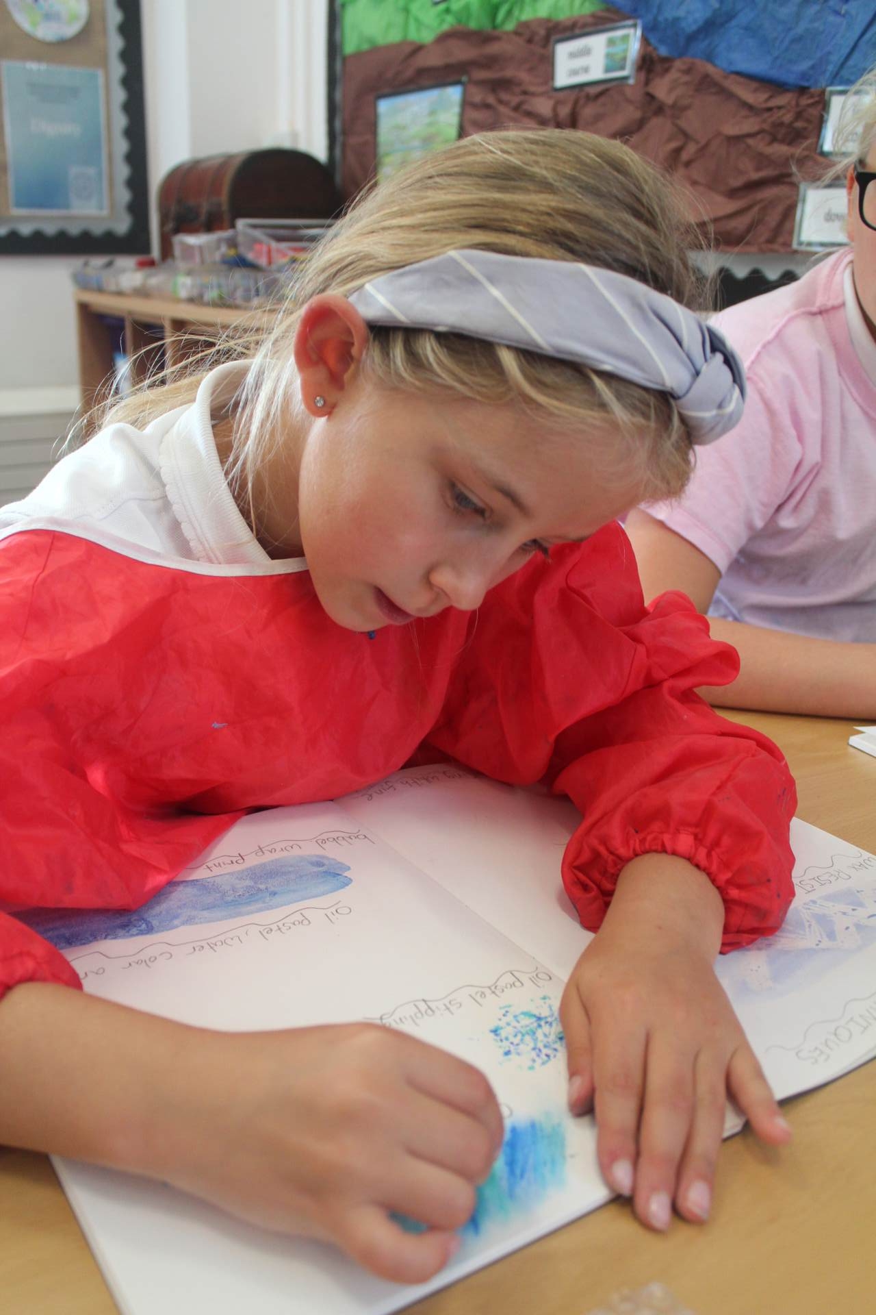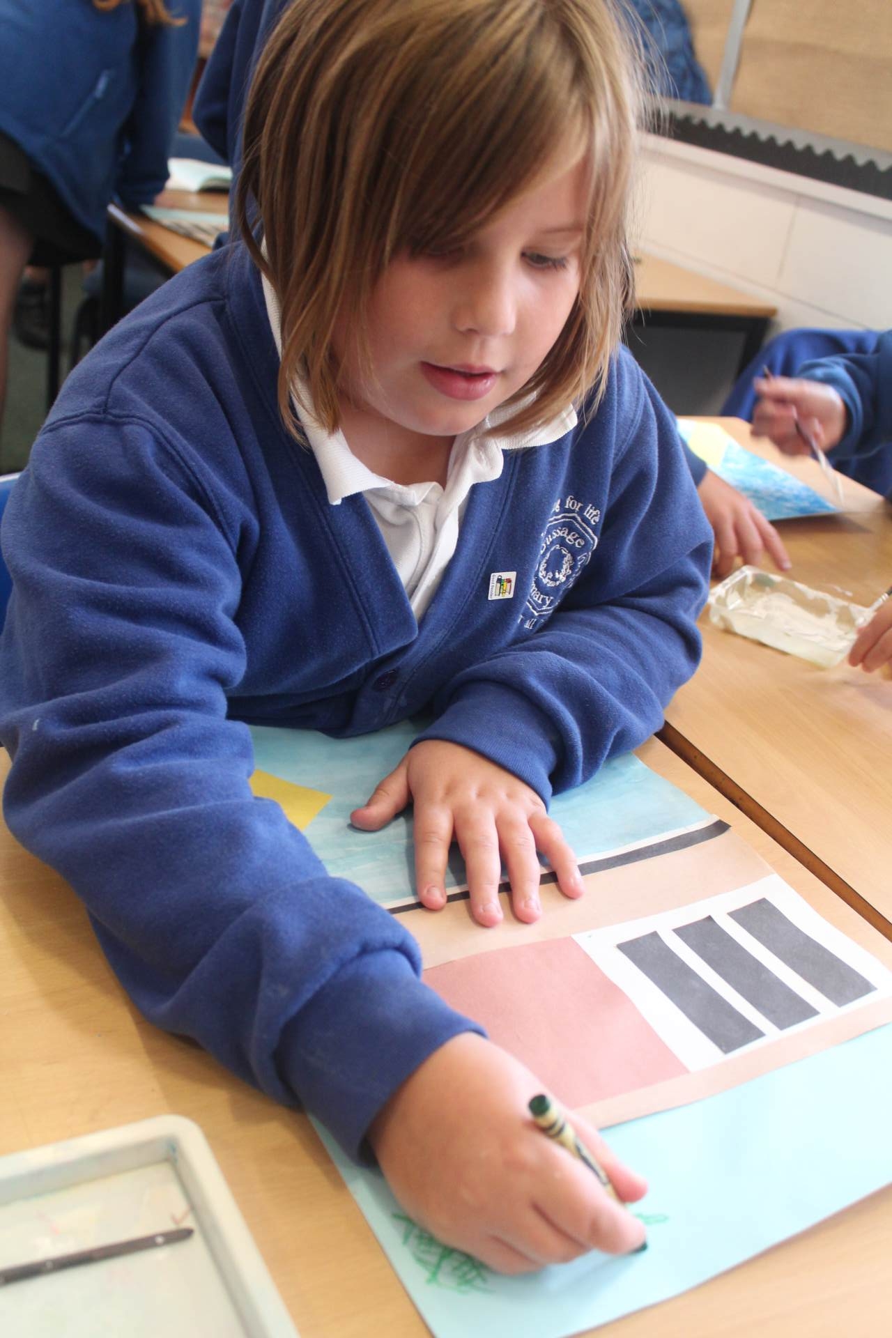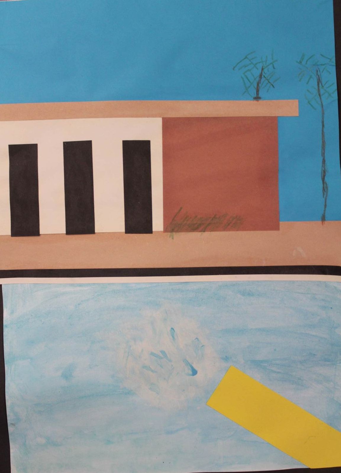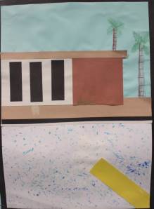 Class 4 have been looking at the British artist David Hockney and his painting A Bigger Splash. The children tried out different techniques to represent water before creating their own version of A Bigger Splash, choosing their preferred water technique for the pool and using collage for the buildings.